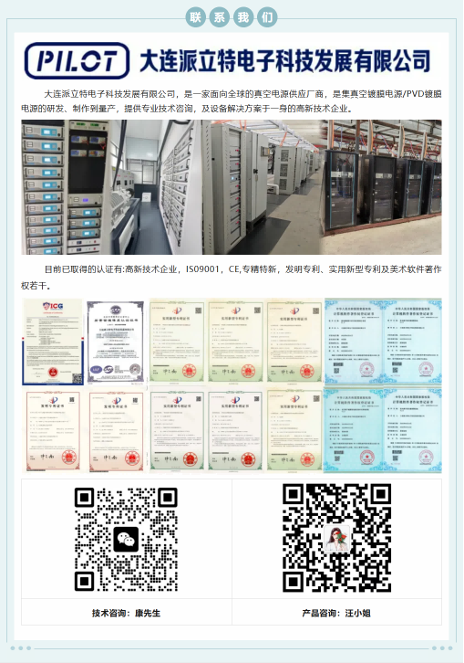 大連派立特電子科技發(fā)展有限公司,是一家面向全球的真空電源供應(yīng)廠商,是集真空鍍膜電源/PVD鍍膜電源的研發(fā)、制作到量產(chǎn),提供專業(yè)技術(shù)咨詢,及設(shè)備解決方案于一身的高新技術(shù)企業(yè)。 主要在售電源品類如下,已廣泛應(yīng)用于諸多業(yè)內(nèi)頭部企業(yè)并得到高度認(rèn)可,支持按需定制: 多弧電源 燈絲電源 清洗電源 轟擊電源 靜電吸附電源 脈沖弧電源 中頻濺射電源 脈沖偏壓電源 離子源電源 直流磁控濺射電源 直流脈沖濺射電源 and so on... 目前已取得的認(rèn)證有:高新技術(shù)企業(yè),ISO9001,CE,專精特新,發(fā)明專利、實用新型專利及美術(shù)、軟件著作權(quán)若干。